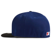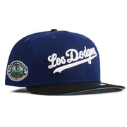 The Dodger Authentic Collection Alt 59FIFTY Fitted cap features an all-over royal blue fabrication with Los dodgers embroidered lettering in white on the front panels and a custom dodgers stadium 50th anniversary patch on the side. The under brim features a light blue color.